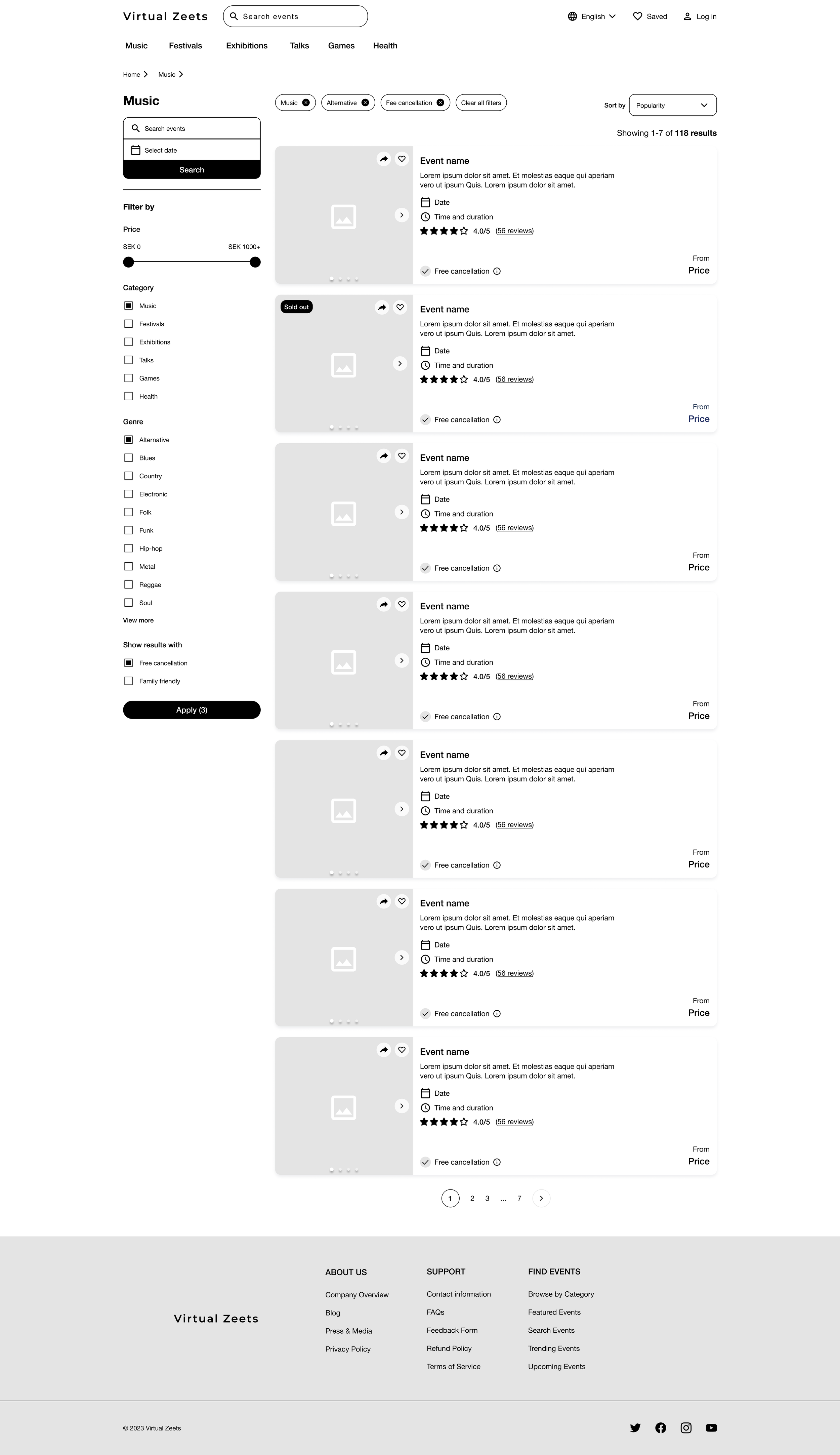 2. Design options for users to sort events based on factors like date or category to facilitate efficient event discovery. Additionally, a range of filters will be available, allowing users to narrow down their search by event type, price range, and more.